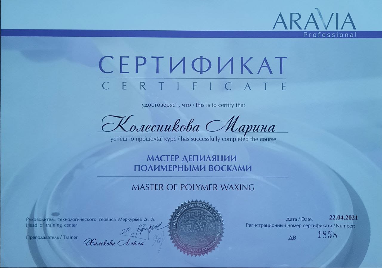 2021 г.- курс "Мастер депиляции полимерными восками" в учебном центре ARAVIA