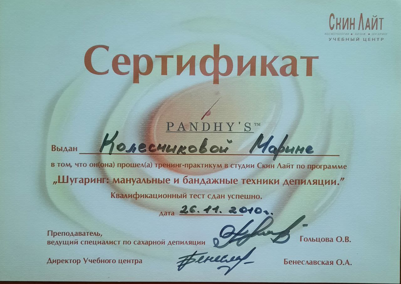 2010 г.- курс "Шугаринг: мануальные и бандажные техники депиляции", студия "Скин Лайт"