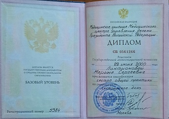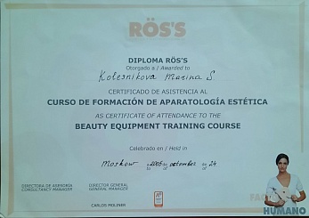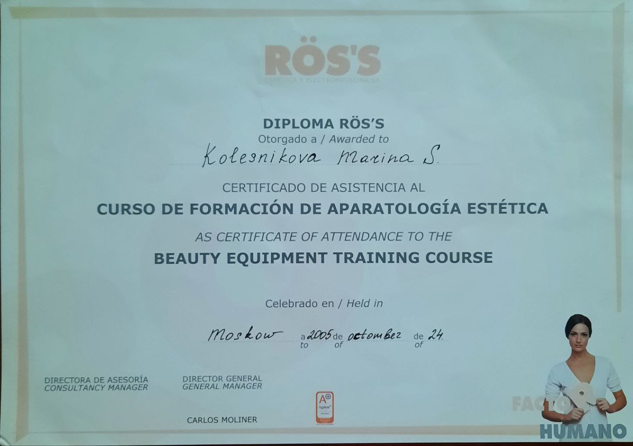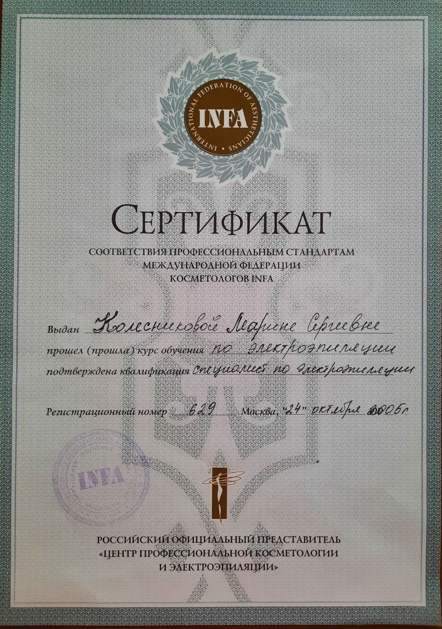 2005 г.- профессиональная переподготовка по программе "Электроэпиляция " в Академии Международного сотрудничества