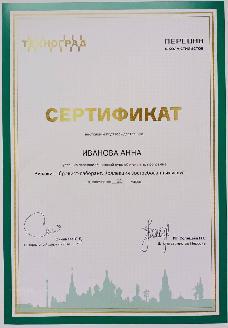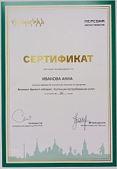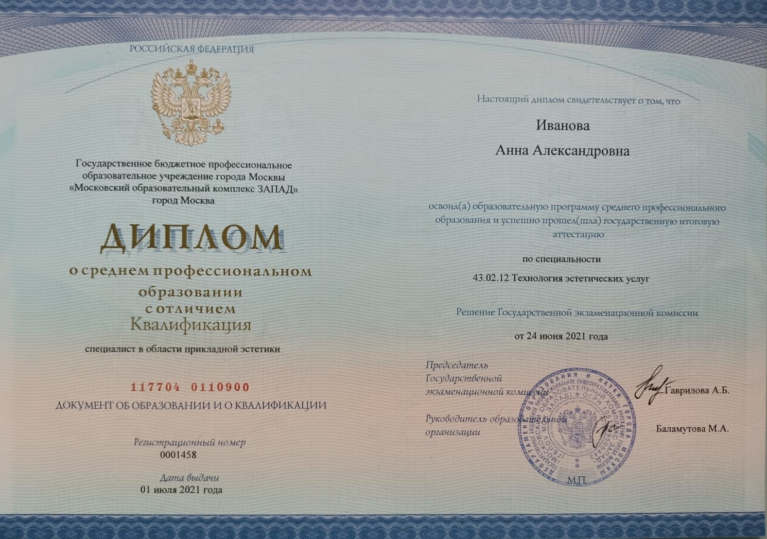2021 г. - окончила ГБПОУ г. Москвы «Московский образовательный комплекс ЗАПАД» по специальности «Технология эстетических услуг».