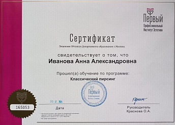 2024 г. - обучение по программе «Классический пирсинг», Первый Профессиональный Институт Эстетики.