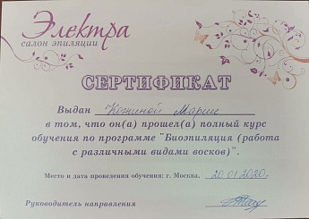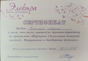 2020 г. - прошла обучение на мастера шугаринга в салоне эпиляции Электра