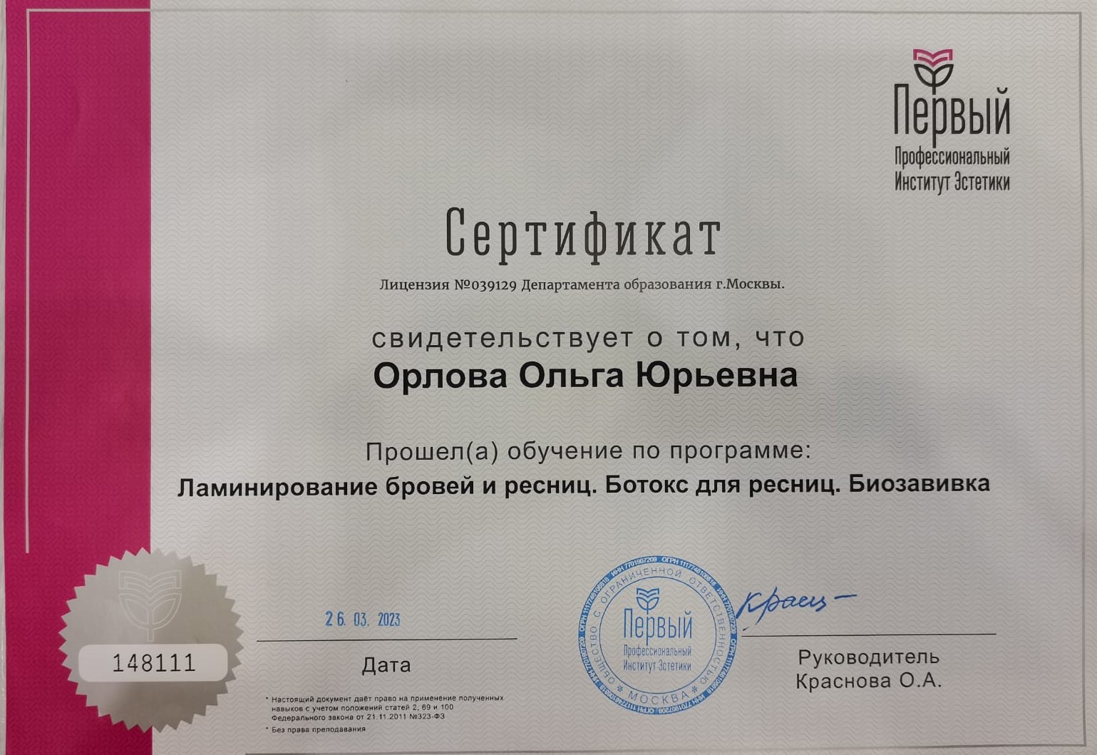 2023 г. - курс «Ламинирование бровей и ресниц. Ботокс для ресниц. Биозавивка», Первый Профессиональный Институт Эстетики