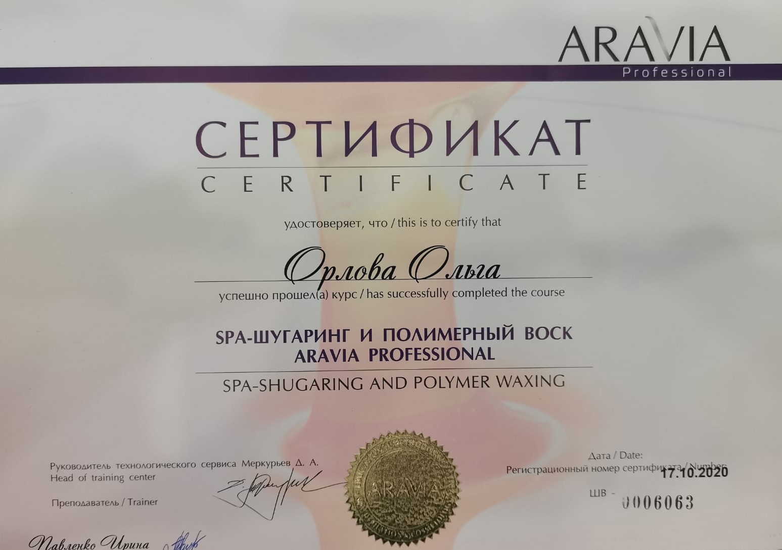 2020 г. - курс «SPA-шугаринг и полимерный воск» в Учебном центре ARAVIA