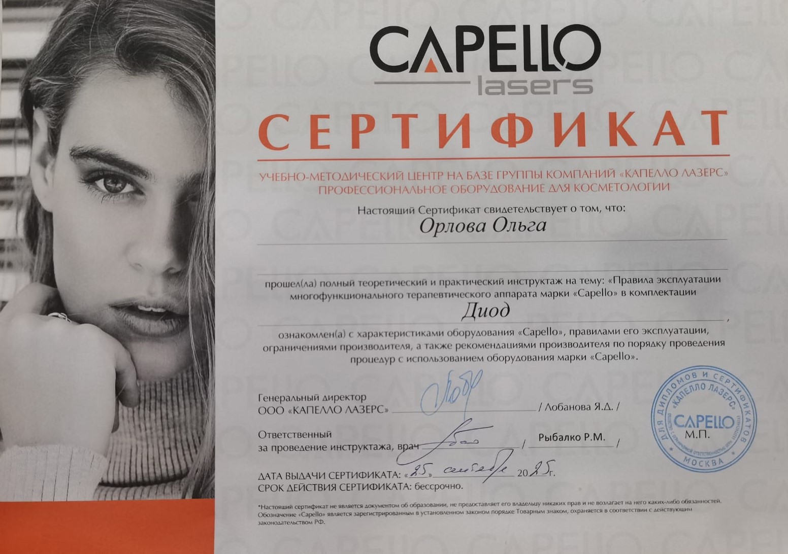 2025 г. - повышение квалификации на диодном лазере Capello, УМЦ Capello Lasers