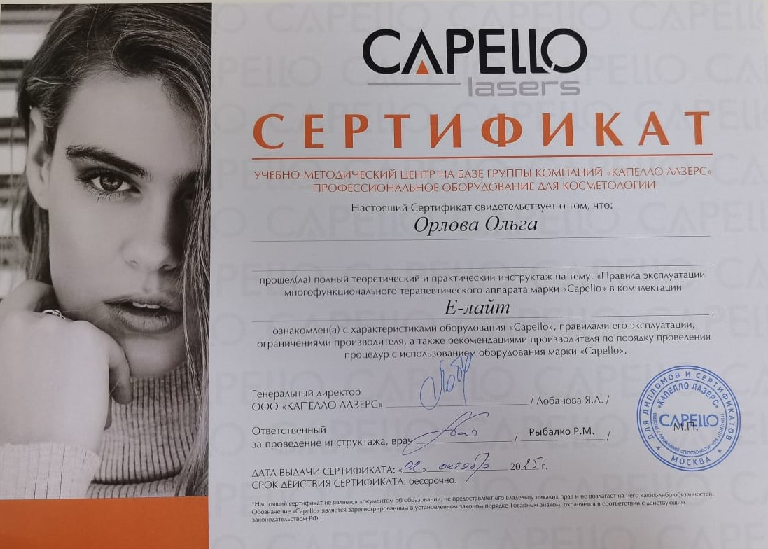 2025 г. - обучение на аппарате E-Light Capello, УМЦ Capello Lasers