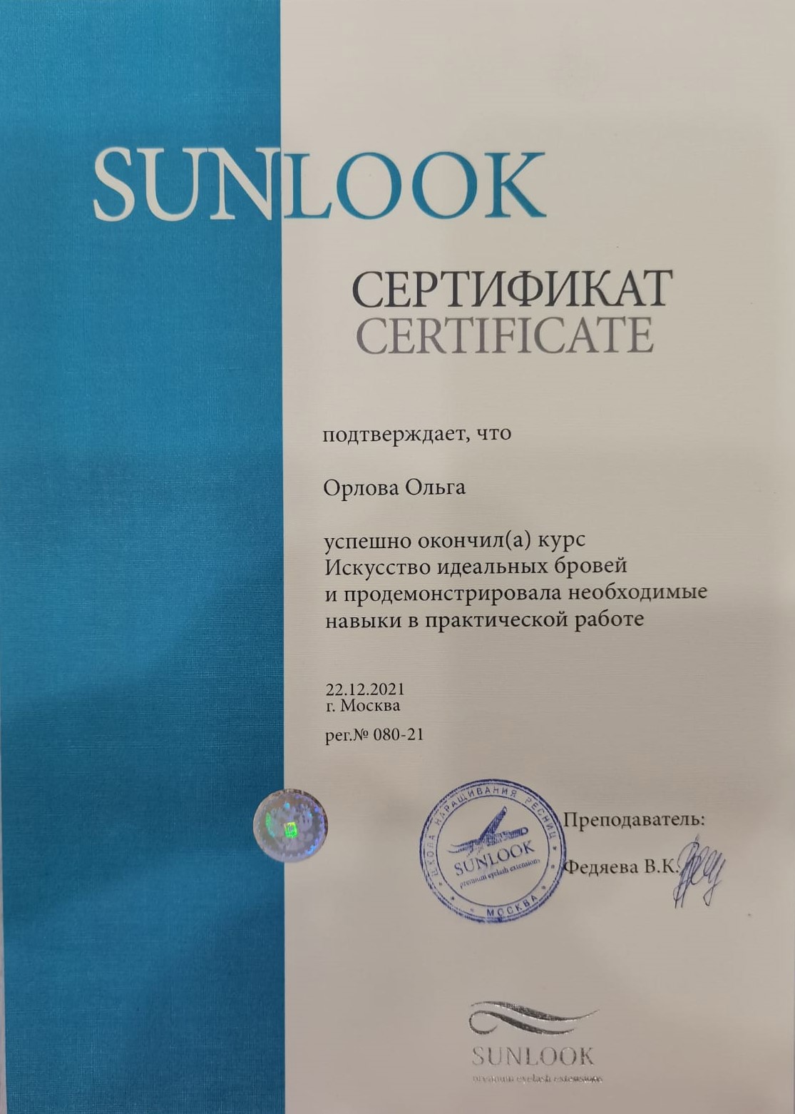 2021 г. - курс повышения квалификации «Искусство идеальных бровей» Учебного центра по наращиванию ресниц Sunlook