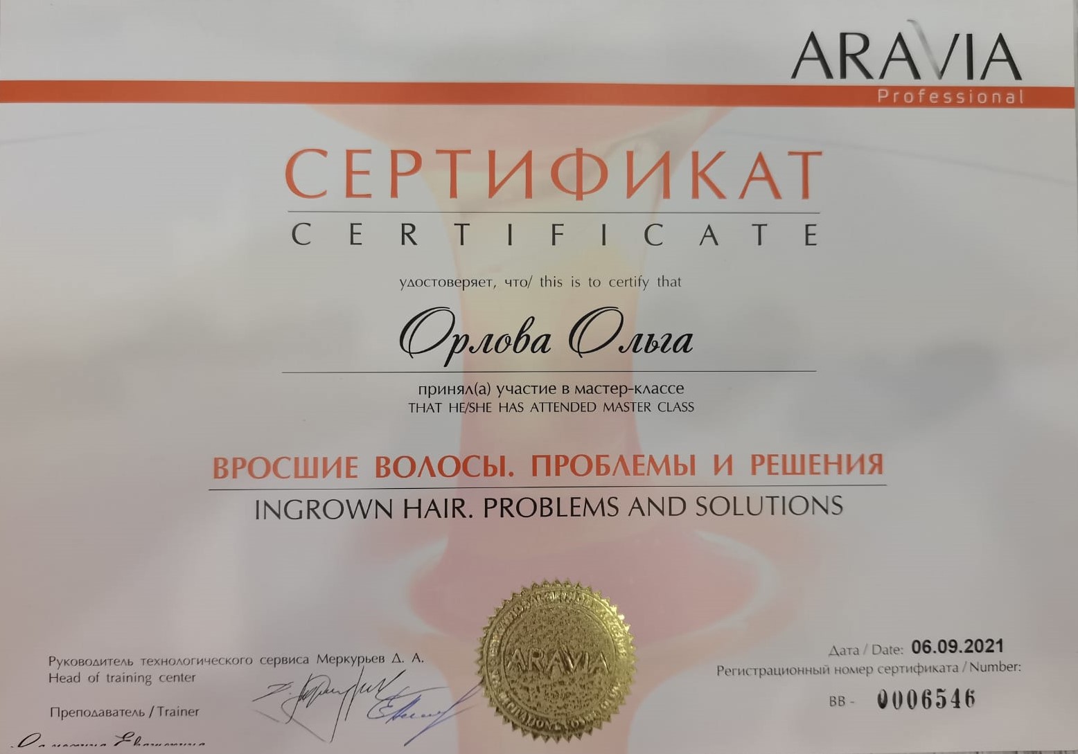 2021 г. - курс «Массаж – уход для лица ARAVIA Professional» в Учебном центре ARAVIA