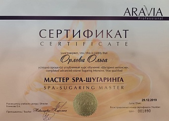 2019 г. - практический курс «Шугаринг- интенсив» в Учебном центре ARAVIA