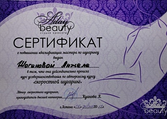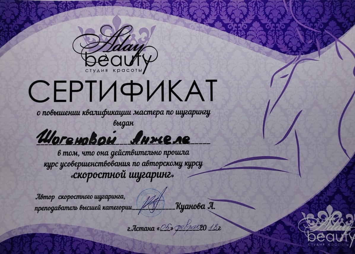 2018 г. - обучение по программе «Скоростной шугаринг», Стулия красоты Aday beauty