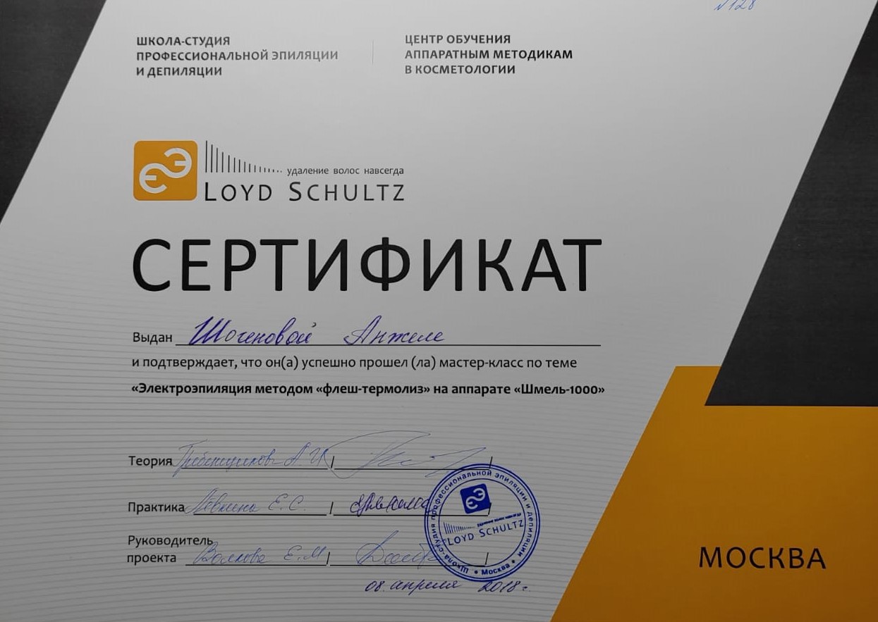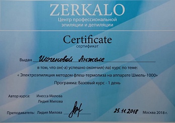 2018 г. - базовый курс "Электроэпиляция методом "флеш-термолиз" на аппарате " Шмель-1000", Центр профессиональной